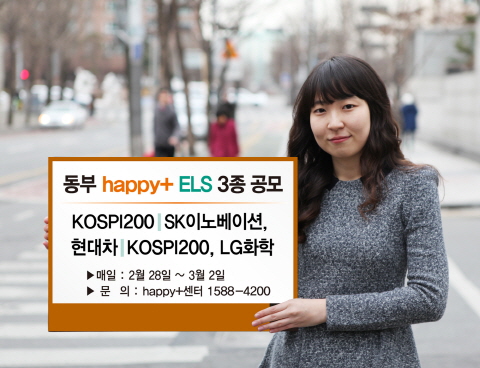 [프라임경제] 동부증권(016610)은 28일부터 내달 2일까지 원금보장 낙아웃형(Knock-Out) '동부 happy+ 파생결합증권(ELS) 제764회'와 스텝다운형 '동부 happy+ 파생결합증권(ELS) 제765회', 스텝다운 월지급식형 '동부 happy+ 파생결합증권(ELS) 제766회' 등 ELS 3종을 판매한다고 밝혔다.
