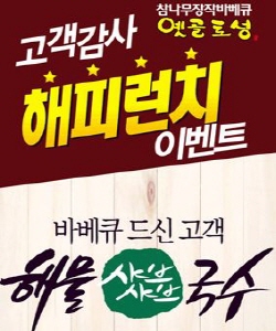 ‘고객감동 해피리필 이벤트’는 오는 3월30일까지 옛골토성 청계산점에서 실시된다. 이벤트 기간 동안 런치타임(오전 11시30분~오후 3시)에 바비큐류를 주문하면 해물 샤브샤브국수가 무료 제공된다.