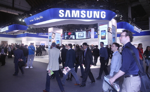삼성전자(005930)가 오는 3월1일까지 스페인 바르셀로나에서 열리는 MWC 2012에서 스마트폰, 태블릿 등 최신 스마트기기 라인업과 콘텐츠·서비스, 첨단기술 등을 선보인다. 사진은 삼성전자 부스.