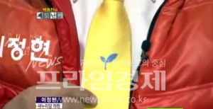 이정현 의원의 넥타이. 호남을 뜻하는 노란색 바탕에 초록색 새싹. 채널A캡쳐.