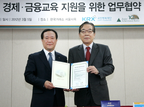[프라임경제] KRX국민행복재단(이사장 김봉수)과 교육전문기관인 JA Korea(회장 김태준)는 5일 오후 3시 거래소 서울사옥에서 청소년을 대상으로 금융교육 사업을 추진키로 하는 업무협약(MOU)을 체결했다고 밝혔다.