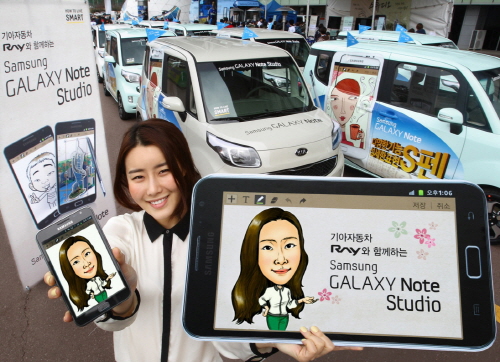 | 삼성전자는 ‘기아자동차 레이와 함께 하는 갤럭시 노트 스튜디오’ 행사를 오는 31일까지 진행한다. 갤럭시 노트를 이색적인 방법으로 알리고 캐리커처를 그려 주는 서비스를 제공한다. 수원월드컵경기장에 등장한 갤럭시 노트 컨셉트카의 모습. | ||