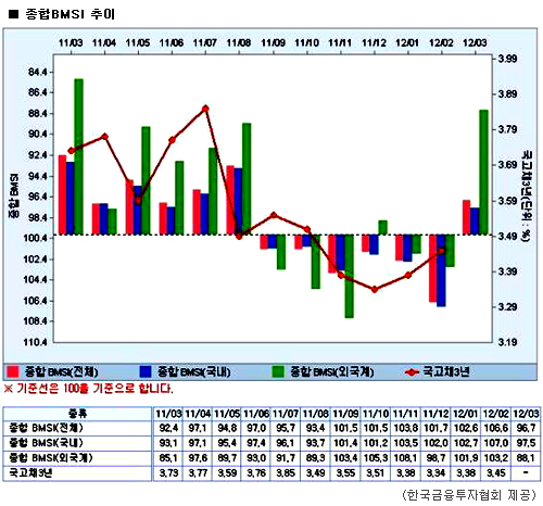 한편 BMSI는 향후 금리와 환율이 어떻게 변동할 것인지 대략적으로 예측할 수 있는 지표를 말한다. 전반적인 채권시장 심리흐름을 읽을 수 있는 지표로 170 이상이면 과열, 100이상이면 호전, 100이하면 악화, 30이하면 패닉을 뜻한다.