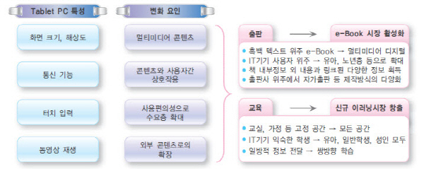 지난 2010년 4월 애플의 아이패드(iPad) 등장, 11월 삼성전자의 갤럭시탭 출시 이후 국내 시장에서 태블릿 PC는 빠르게 퍼져나갔다. 태블릿 PC 보급화는 방송, 광고, 게임 등 주요 미디어 산업에 새로운 변화와 혁신을 촉발시켰으며, 교육과 출판 환경도 크게 변화할 것으로 보인다.