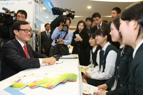| 우리은행 고졸 채용설명회에서 이순우 행장이 고등학교 학생들을 대상으로 상담하고 있다. | ||