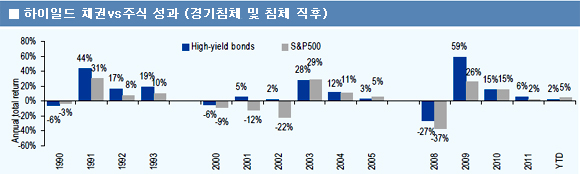 | 역사적으로 하이일드 채권은 하락장에서 주식 대비 초과 수익을 기록해왔다. 경기침체 직후에는 주식과 비슷하거나 더 높은 성과를 시현했다. 1990~1993년 하이일드 채권은 S&P500지수를 37% 초과 달성했으며 2000~2005년에는 55% 초과 달성했다. (2012년 1월24일 기준/JP모간증권 제공) | ||