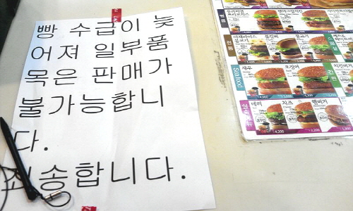 하지만 매장 주문대에 “수급이 늦어져 일부품목의 판매가 불가능하다”라는 문구로 고객의 주문자체를 차단한 경우는 처음이라 놀라웠습니다. 그제야 주변을 둘러보니 이 인쇄물은 매장주문대뿐 아니라 주문대 뒷편에 위치한 메뉴 하단 등 곳곳에 부착돼 있더군요.