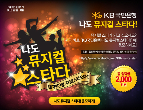 이번 행사는 뮤지컬 배우는 꿈꾸는 대학생이라면(대학원생·휴학생 포함/기존 프로무대 활동자는 제외) 누구나 참여할 수 있다. 참가를 원하는 학생은 본인 또는 그룹의 뮤지컬 시현 동영상을 유튜브에 올린 후 국민은행 ‘나도 뮤지컬 스타다!’ 페이스북 사이트에 유튜브 URL 및 신청 사연을 등록하면 된다.