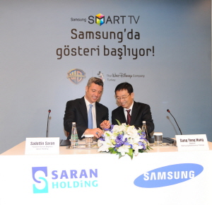 | 삼성전자 터키법인과 터키 최대 컨텐츠 공급업체 사란 홀딩스가 스마트 기기용 컨텐츠 독점 공급 계약을 맺고 있다. 사진 좌측부터 사란 홀딩스 대표 사데틴 사란 CEO, 삼성전자 터키법인장 홍성룡 상무. | ||