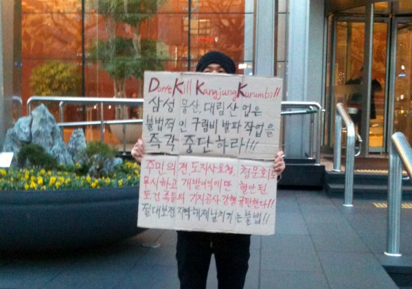 D.K.K.K(Don't Kill Kangjung Kurumbi, 강정 구럼비를 죽이지 마세요)라고 글씨가 적힌 플래카드에는 대림산업과 삼성물산이 불법적인 구럼비 발파작업을 진행하고 있으며 개발이익에만 혈안이 돼 있다는 내용이 담겨있었습니다.