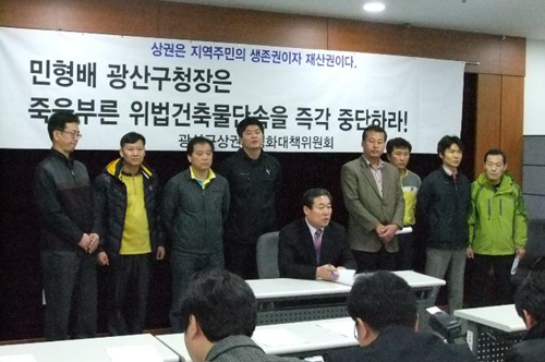 또 “강운태 광주시장이 시민과의 대화(2011.10.28(금))에서 광산구의 위반건축물단속과정과 행정처리절차의 문제점을 지적하면서, 권고․지시한 위반건축물 문제해결을 위한‘주민과의 협약 체결’을 즉시 이행 할 것”을 촉구했다.