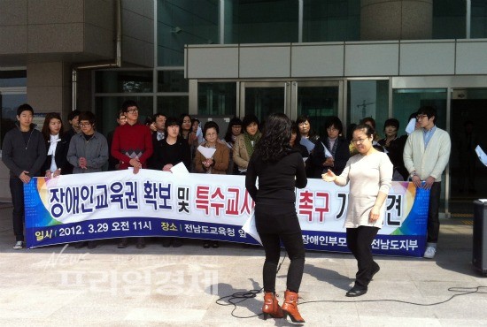 전남 장애인 연대회의에 따르면 전국 국.공.사립 학교 특수교사는 13,447명으로 법정정원의 68.5%(법정정원 19,701명)에 불과, 비장애인들을 교육하는 교사확보율(유치원 73.2%, 초등 89.1%, 중등 80.4%) 보다 훨씬 저조하다고 주장했다.