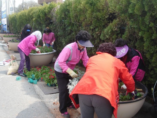 [프라임경제] 전남 광양시 골약동 주민들이 29일 주요 도로변 대형화분과 가로화단에 봄꽃 심는 행사를 갖고 있다.
