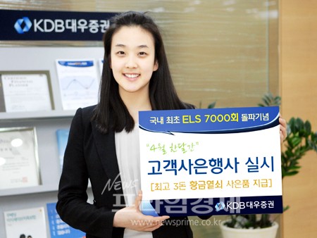 [프라임경제] KDB대우증권(006800)은 국내 금융투자업계 최초로 ELS 발행 건수가 7000회를 돌파한 것을 기념해 30일부터 특별 이벤트를 진행한다. ELS 및 DLS 청약고객이라면 이벤트 기간 중 가입금액에 따라 최고 3돈짜리 황금열쇠를 받을 수 있다.