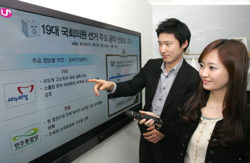 한편, LG유플러스는 ‘소셜TV’와 ‘Smart Poll’ 서비스 출시에 맞춰 고객들의 4.11 총선에 대한 다양한 의견과 정당별 정책에 대한 본인의 찬반 의견 등을 설문조사 한다.