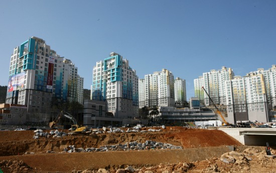 | 지난 3월에 촬영된 여수박람회장 인근 엑스포타운. 현대건설이 시공해 박람회 행사 이후 '엑스포 힐스테이트'로 변모된다. | ||