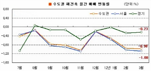 부동산정보업체 닥터아파트에 따르면 3월 수도권 재건축 매매가 변동률은 -0.98%로 지난 2월(-0.95%)에 비해 0.03% 더 하락한 것으로 나타났다.