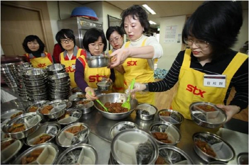 | 저소득 독거노인에게 전달할 도시락을 포장하고 있는 STX가족봉사단원들. | ||