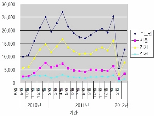 | 2010~2012년 수도권 아파트 실거래건수 그래프에서 DTI 규제 환원 전인 2010년 8·29대책 시기와 DTI 규제 환원 후인 2011년 3·22대책 시기를 보면 눈에 띄는 변화가 있다는 것을 알 수 있다. 자료는 부동산써브. | ||