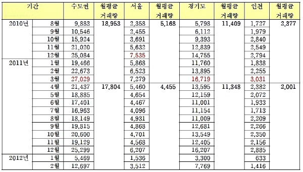 특히, 수도권은 한시적으로 완화된 DTI대출규제를 피해 2011년 3월 2만7029건의 최고 거래량을 기록한 후 좀처럼 거래량이 회복되지 못하고 있다. 서울지역은 같은 기간 –13.8%(5168건→4455건), 인천광역시도 -15.8%(2377건→2001건) 아파트 거래가 축소돼 DTI규제강화를 실감케 했다.