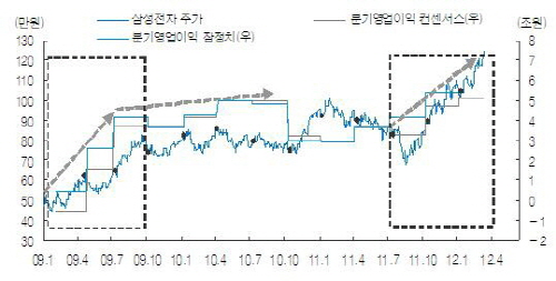 이어 “삼성전자의 2012년 분기실적은 연말 대비 13~15%씩 상향조정됐다”며 “현재 1분기 영업이익 컨센서스는 5조1000억원까지 상향됐으며 연간 영업이익은 연말대비 약 3조원 이상 상향 조정된 24조원에 육박하고 있다”며 삼성전자의 어닝 모멘템은 코스피의 든든한 우군 역할을 할 것으로 전망했다.
