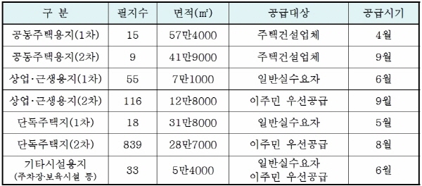 올해 하반기부터 세종시로 이전하는 공무원 등 이주 종사자들의 주거안정을 지원하고 세종시 개발을 활성화하기 위함이다. 지난해 민간건설사로부터 환수한 정부청사 인근지역내 공동주택지와 1-1생활권내 위치한 우월 토지를 선별해 공동주택용지 15필지(57만4000㎡)를 4월초 1차 공급하고, 부동산 시장여건 등을 감안하여 9필지(41만9000㎡)를 9월중 2차 공급할 계획이다.