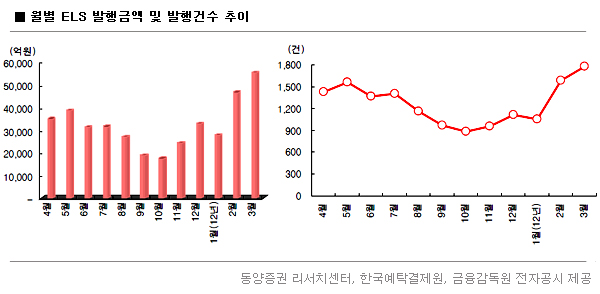 동양증권 이중호 연구원은 “과거 볼 수 없었던 다수의 소규모 ELS 설정이 늘고 있다”며 “연초 이후 코스피 지수가 크게 상승하면서 개별 종목에 투자하는 공격적인 ELS 상품보다는 지수형 원금 비보장형 ELS 상품이 대거 등장하고 있는데 방어적인 투자자들이 펀드 대신 ELS로 지수 투자에 나선 것으로 보인다”고 말했다.