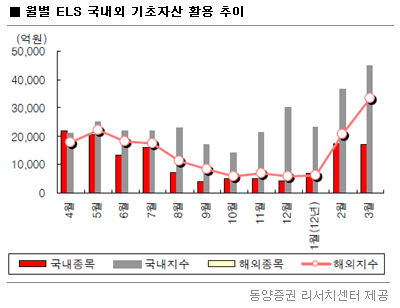 이중호 연구원은 “3월 지수상승은 삼성전자, 현대차 등 일부 대형주의 영향이 컸던 측면이 있다”며 “4월에는 자동차 관련 종목의 ELS 발행이 늘고 있다는 점을 주목할 만하다”고 덧붙였다.