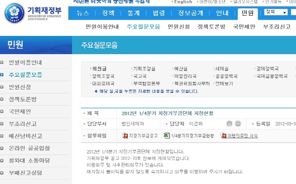 | 기획재정부에서는 기부금을 받을 수 있는 단체들을 관리하고 기부자에게 혜택을 주고 있다. 아울러 단체에도 기부금 접수 및 운영와 관련, 비용이나 손금 처리를 위해 몇 가지 절차 의무를 두고 있다. 기재부 홈페이지 관련 영역의 화면. | ||