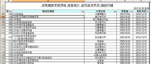 | 기획재정부에서 금년 3월말 기준으로 작성한 자료에 의하면, 미래숲은 지정기부금단체로 관리 대상임을 알 수 있다. | ||