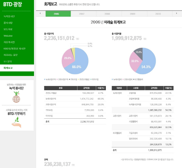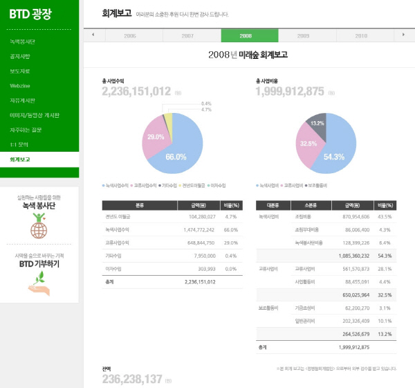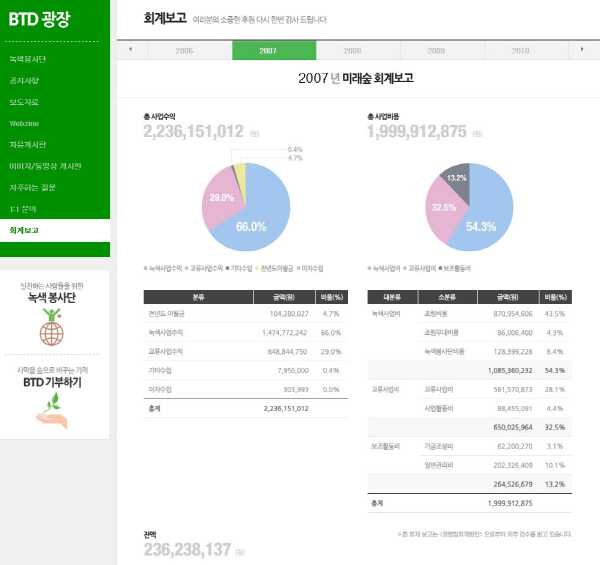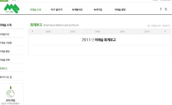 | 미래숲의 자매기구인 BTD는 그나마 회계 자료를 공개하는 외양은 갖췄으나, 3년분 이상 동일한 자료가 반복되고 있다. | ||