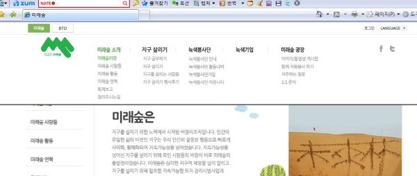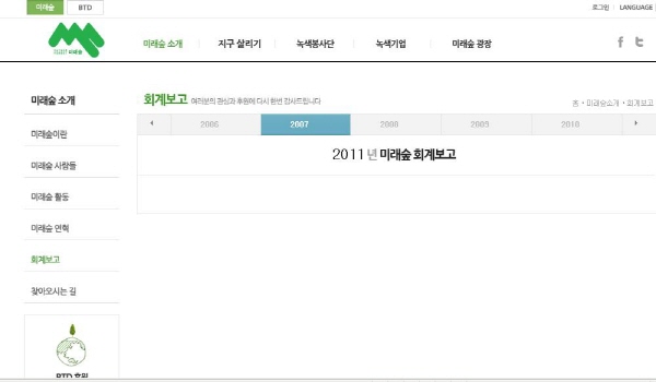 | 미래숲 홈페이지 메인. 여러 기능과 섹션이 있으나, 기획재정부가 지정기부금단체에 요구하는 정관 공개나 기부금 사용 내역 관리 등은 어느 곳에서도 제공되지 않는다. 회계 영역으로 들어가도, 자료가 없이 비어 있다. | ||