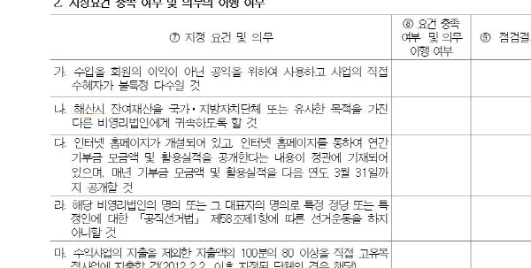 그런데 같은 페이지의 ‘의무이행 및 서식’ 등을 감안해 보면, 이러한 단체는 지정의 반대급부로 영수증 발부 의무 등을 지며 특히 △ 인터넷 홈페이지를 개설하고 △ 정관에 기부금의 모금 실적 및 사용 내역을 공개한다는 뜻을 기재, 공표하고 △ 그러한 사용 내용을(즉 회계 공개로 볼 것인데) 다음연도 3월31일까지 공표하도록 하고 있다.