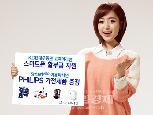 [프라임경제] KDB대우증권(006800)은 스마트폰 거래 고객을 위한 사은 이벤트를 진행한다고 6일 밝혔다. 행사는 이달 27일까지 진행되며 KDB대우증권의 스마트폰 증권거래 어플리케이션인 ‘스마트 네오(Smart Neo)’ 이용고객을 대상으로 고급 가전제품과 최신 스마트폰 할부금을 지원하는 내용이다.