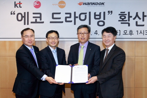 [프라임경제] 한국타이어(대표 서승화, 000240)가 오늘 오전 서초동 BC카드 사옥에서 KT, 현대카다이렉트, BC카드와 함께 '에코 드라이빙 확산 협력' MOU를 체결하고 친환경 운전문화 확산에 나선다.