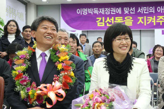 | 김선동 의원 부부가 11일 개표방송에서 당선이 확실시되자 꽃다발을 받은채 TV를 밝은 표정으로 시청하고 있다. | ||