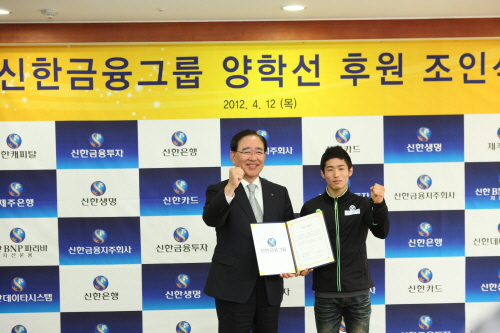 신한지주 한동우 회장은 후원식에서 “양학선 선수가 올림픽 출전 사상 최초로 체조에서 금메달을 목에 걸 수 있도록 물심양면으로 지원을 아끼지 않겠다”고 말했다.