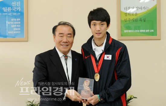 [프라임경제] 장휘국 광주시교육감은 12일 오전 집무실에서 이집트 샤름엘쉐이크에서 열린 제9회 세계청소년태권도선수권대회 남자부 55kg에 참가, 금메달을 획득하고 최우수선수(MVP)에 선정된 첨단고 김영석(2년) 선수를 격려했다.(좌측 장휘국 교육감과 김영석 선수)
