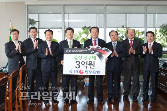 광주은행은 12일 오전 11시 30분 전남도청 도지사실에서 F1코리아 그랑프리 입장권 구매행사를 가지고 올해 10월 개최되는 F1대회 성공개최를 위한 붐 조성에 나섰다. 이 자리에는 박준영 전남도지사, 박종문 F1대회사무총장 등 관계자들이 참석해 자리를 빛냈다.