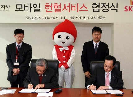 SK텔레콤과 대한적십자사는 1월 9일 오전 11시, 을지로 SK텔레콤 본사 33층에서 SK텔레콤 김신배 사장과 한완상 대한적십자사 총재가 참석한 가운데『모바일 헌혈 서비스』협정식을 갖고, 긴급 혈액 확보를 위한 헌혈자 모집 사업에 공동 협조하기로 했다.