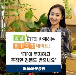 [프라임경제] 미래에셋증권(037620)은 ETF 거래 고객을 대상으로 푸짐한 경품을 증정하는 '봄날, ETF와 함께하는 BIG3 데이트' 이벤트를 4월16일(월)부터 6월15일(금)까지 실시한다고 밝혔다.