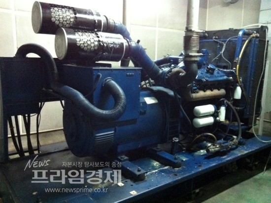 광주 북구 신안동 소재 제일오피스텔에 설치된 비상발전기. 비상발전기 엔진이 건물 준공보다 무려 7년이나 앞서 제조됐고, 국내 딜러가 해당제품을 수입하지 않았다고 밝혀 고철로 들여와 조립했다는 의혹이 제기되고 있다. |