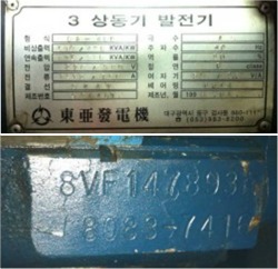 | 비상발전기 제원표(위)와 엔진의 시리얼넘버. | ||