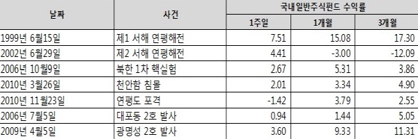 이 같은 결과는 펀드시장에서도 마찬가지다. 이날 펀드평가사 제로인에 따르면 과거 주요 북한 악재 및 대포동 2호, 광명성 2호 등 미사일 발사 이슈가 있었을 때 국내 주식형펀드 수익률은 추세적인 흐름에서 벗어나지 않았다.