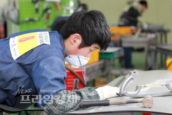 | 전남기능경기대회에서 판금을 하고 있는 전남 특성화고 학생. | ||
