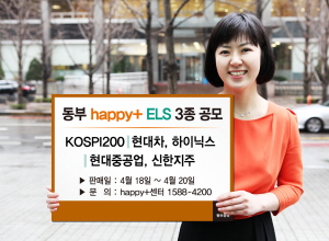 [프라임경제] 동부증권(016610)은 18일부터 20일까지 원금보장형 '동부 happy+ 파생결합증권(ELS) 제807회'와 스텝다운형 '동부 happy+ 파생결합증권(ELS) 제808회', 스텝다운 노낙인(No Knock-In)형 '동부 happy+ 파생결합증권(ELS) 제809회' 등 ELS 3종을 판매한다고 밝혔다.