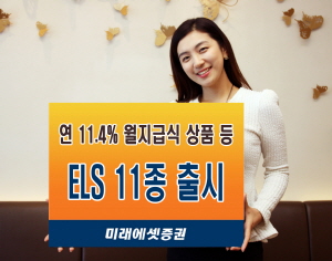 [프라임경제] 미래에셋증권(037620)은 연 11.4% 월지급식 상품을 포함한 원금비보장형 ELS 11종을 오는 27일(금)까지 총 900억 규모로 판매한다고 밝혔다.