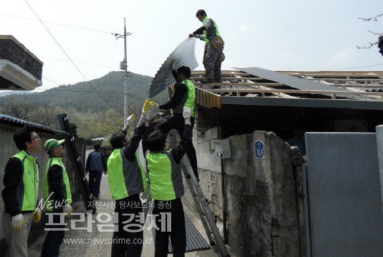 [프라임경제] 한국농어촌공사 곡성지사(지사장 이상천) 직원 15명은 지난 23일 '농어촌 노후주택 고쳐주기 사업'의 일환으로 곡성읍 교촌리 독거노인 양덕례씨 집에서 지붕 고쳐주기 봉사활동을 실시했다.