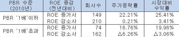 이를 기준 삼아 2010년말 PBR수준별 ROE증가 및 감소법인의 2011년도 연초대비 최근 주가의 등락률을 비교했을 때 ROE증가 법인은 주가상승률이 높았으며 시장수익률 대비 초과 상승했다. 특히 PBR수준이 1배 이하인 경우의 주가상승률이 더 좋았다.