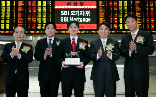 | 왼쪽부터 상장회사협의회 서진석 부회장, SBI코리아홀딩스 다카하시 요시미 대표, SBI모기지 마루야마 노리야키 대표, 이창호 유가증권시장본부장, 하나대투증권 장승철 대표가 상장기념패 전달 후 기념촬영을 하고 있다. | ||